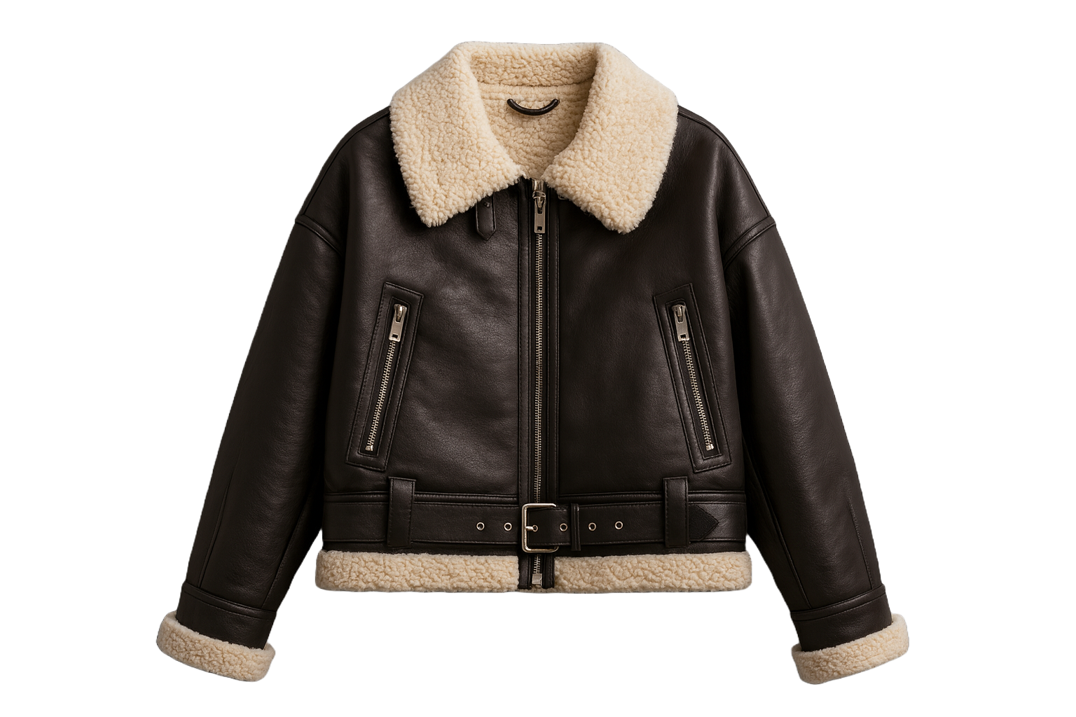 The Arctic Luxe Faux Shearling Aviator Jacket brings the iconic aviator style with modern and sustainable materials. Crafted from premium vegan leather and lined with soft faux shearling on the collar and cuffs, it offers warm comfort without using any animal-based materials. It features a durable front zipper, side zipper pockets, and an adjustable waist belt for an elegant and structured fit. A versatile, fashionable, and high-end piece — perfect for styling winter looks with luxurious, cruelty-free sophistication.